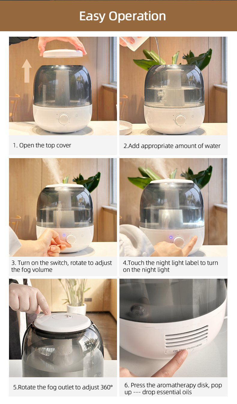 Nasz nowy ultradźwiękowy nawilżacz do aromaterapii o dużej pojemności 5 litrów, elektryczny domowy hotel, sprawia, że korzystanie z niego jest bezpieczniejsze i bardziej intymne. Jest bardziej miękki niż konwencjonalne nawilżacze i nie przeszkadza w nauce, pracy i odpoczynku. Napełnianie zbiornika na wodę od góry, wygodny i szybki, przezroczysty zbiornik na wodę, widać poziom wody. Nano-drobna mgiełka 300 ml/h, maksymalna mgiełka może działać przez 8 godzin, minimalna mgiełka może działać przez 50 godzin, może dodać aromaterapię, aby uspokoić nastrój. Korpus nawilżacza jest wyposażony w niezależne światło nocne, dzięki czemu Twoja noc będzie pełna bezpieczeństwa.